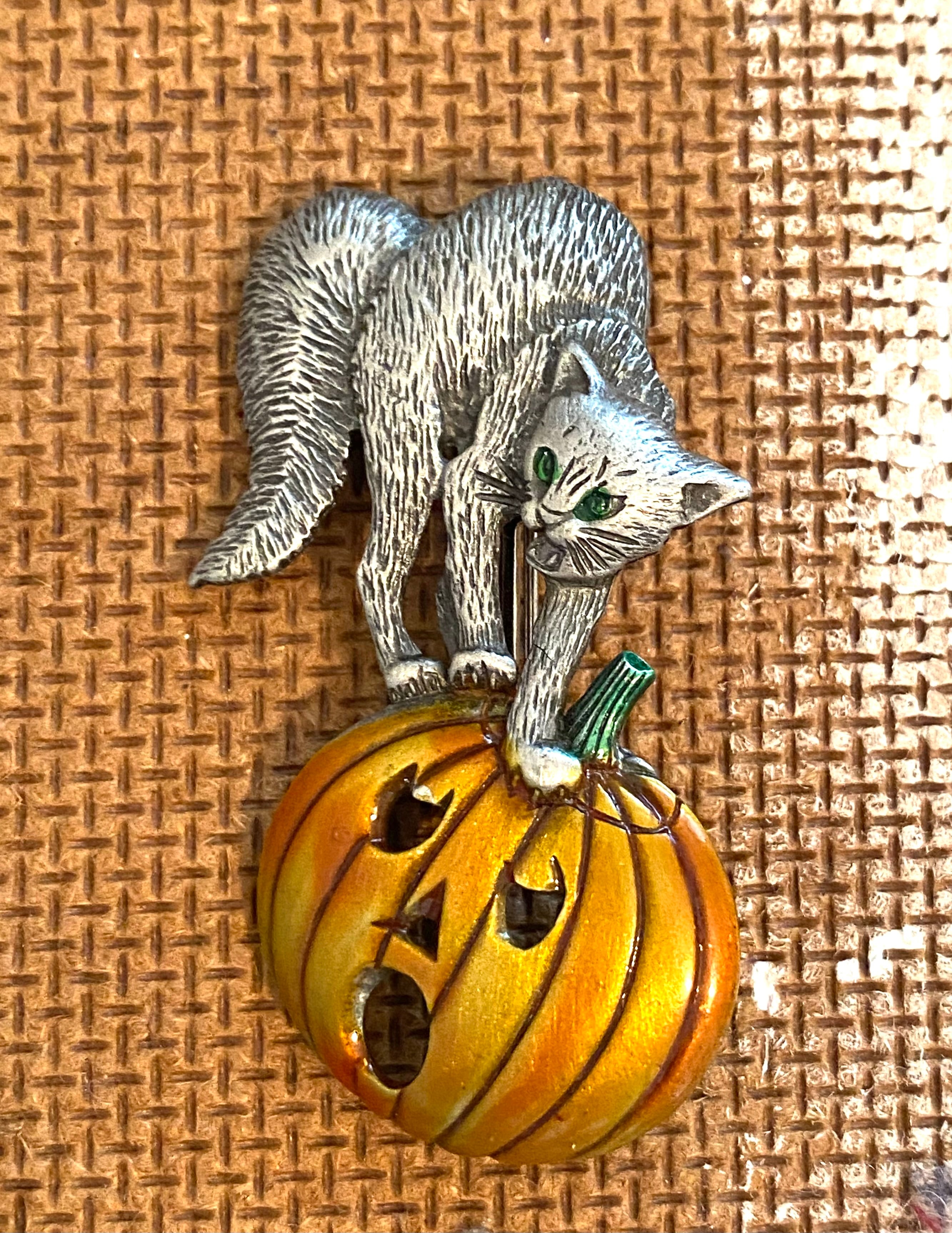 ハロウィンのかぼちゃの上でシャーしている猫さんのブローチ【アメリカより入荷】