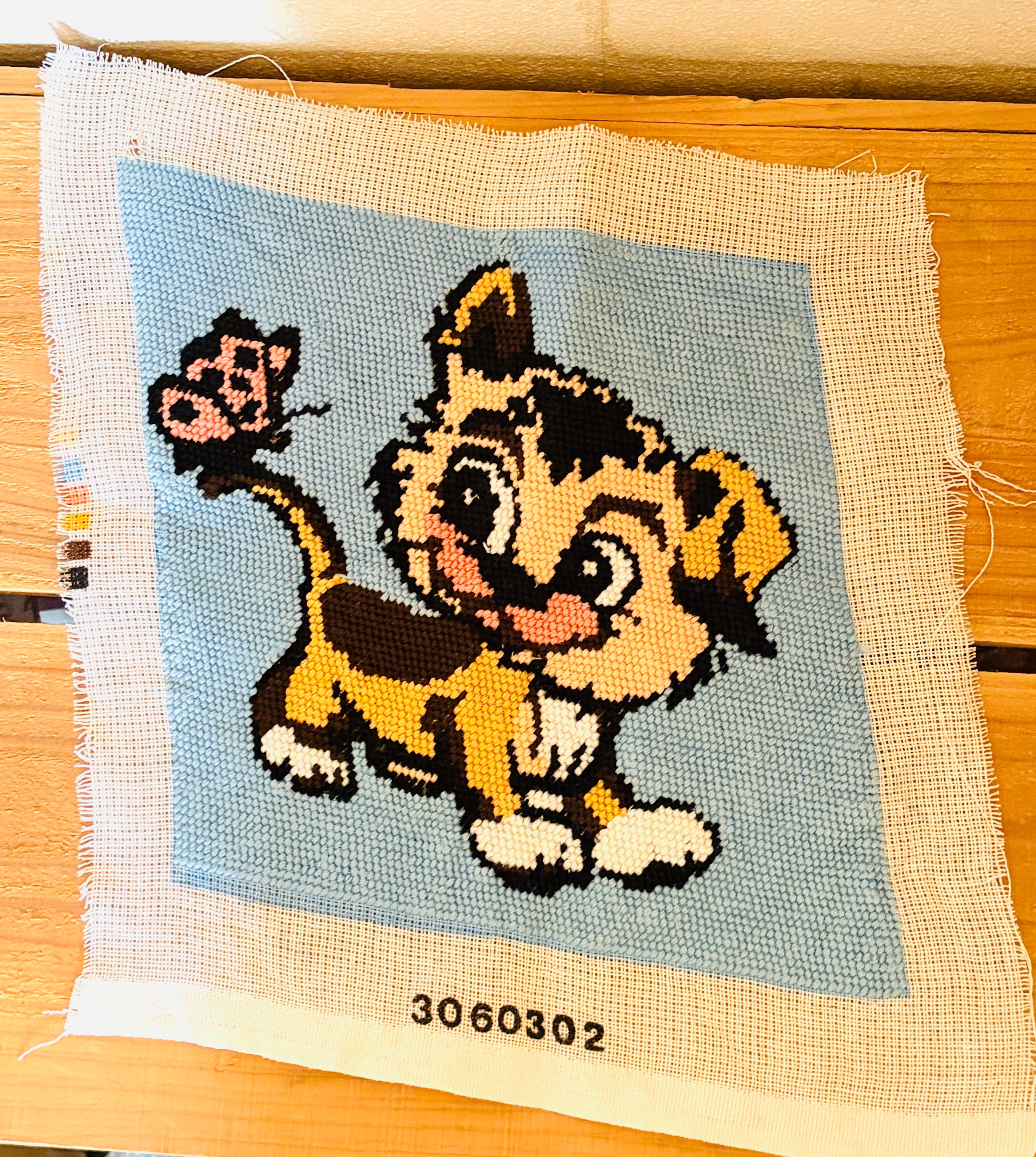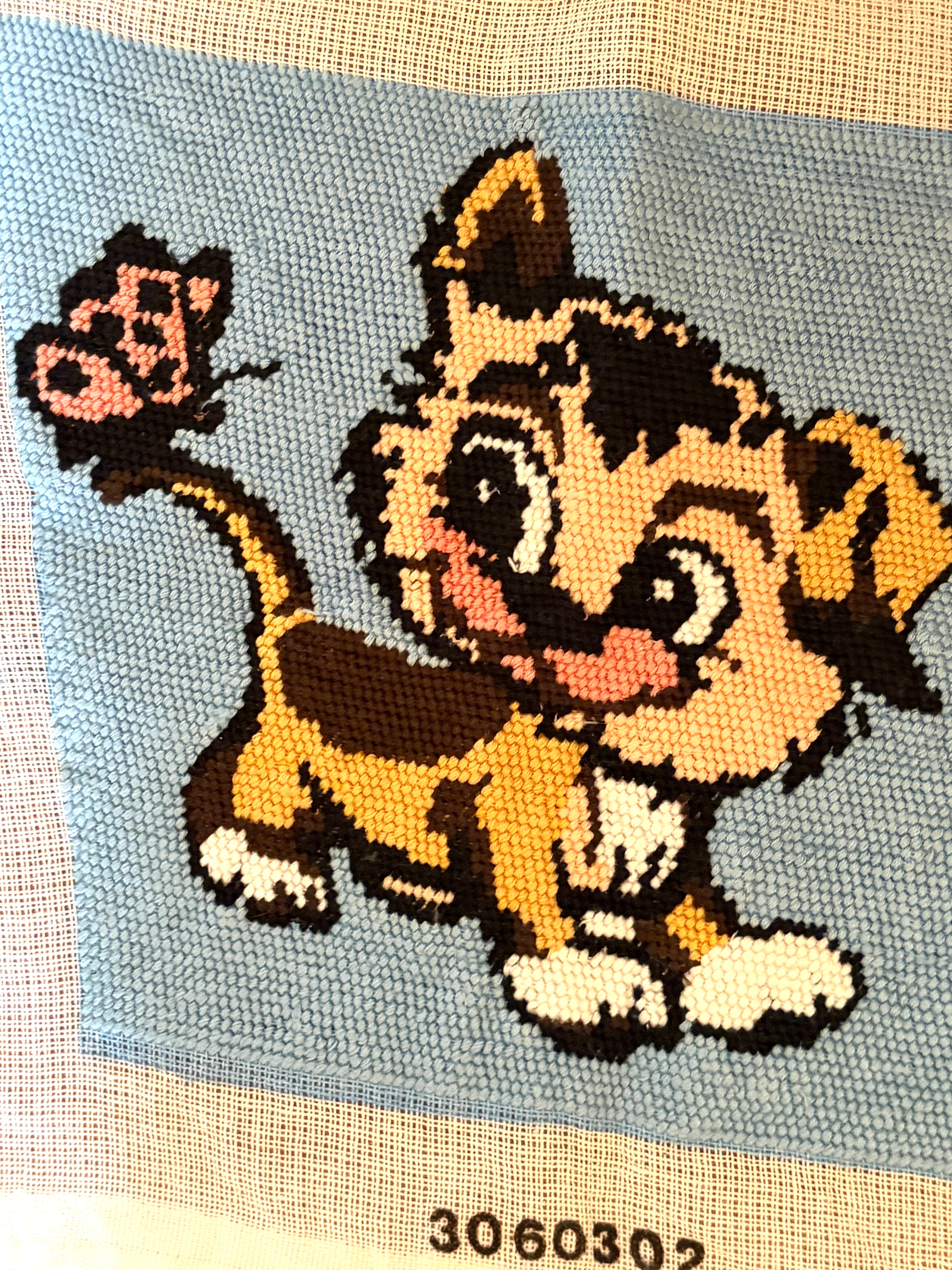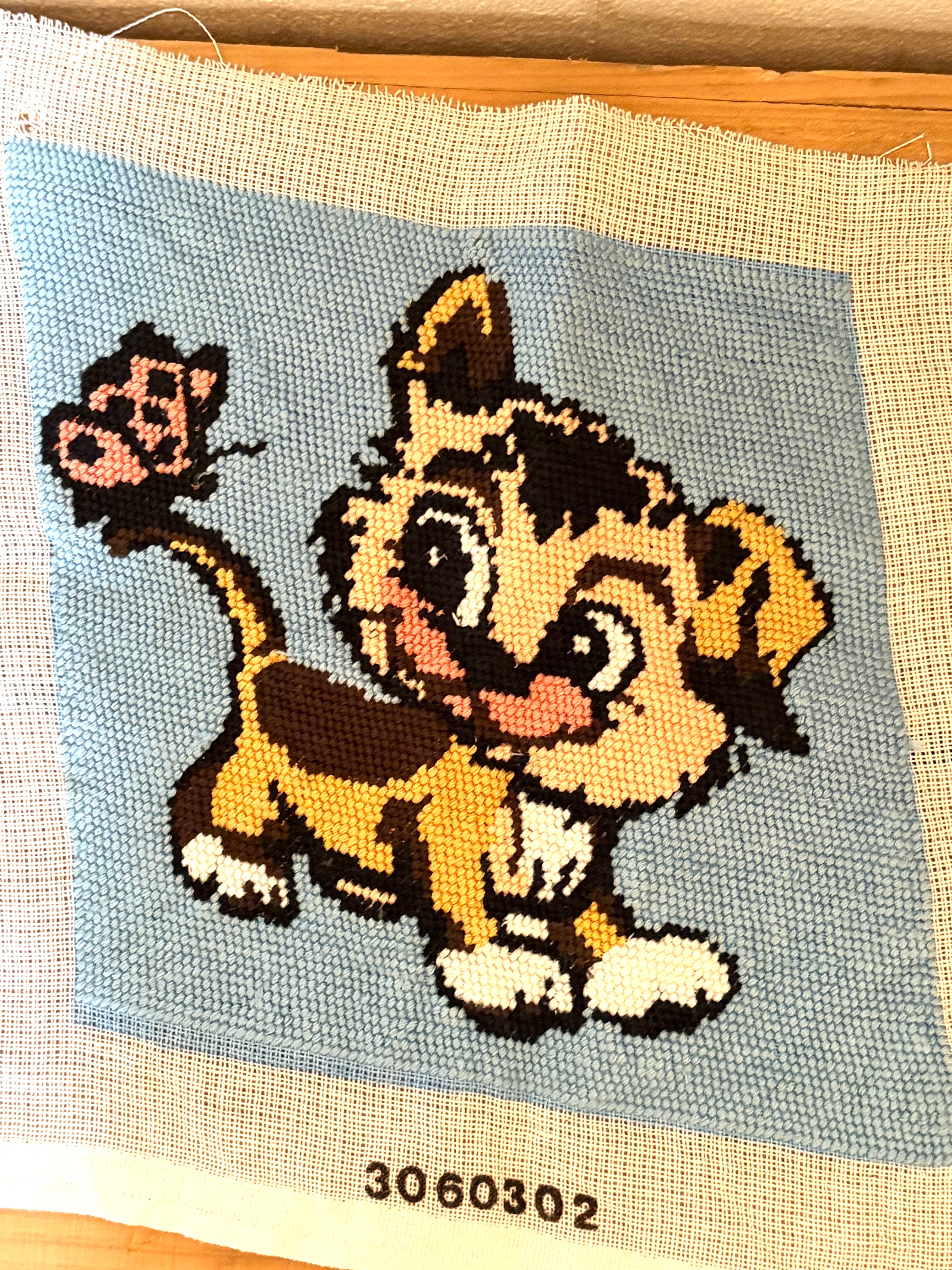 蝶々とトラ柄の猫さんのニードルポイント【ハンドメイドのヴィンテージアイテム】