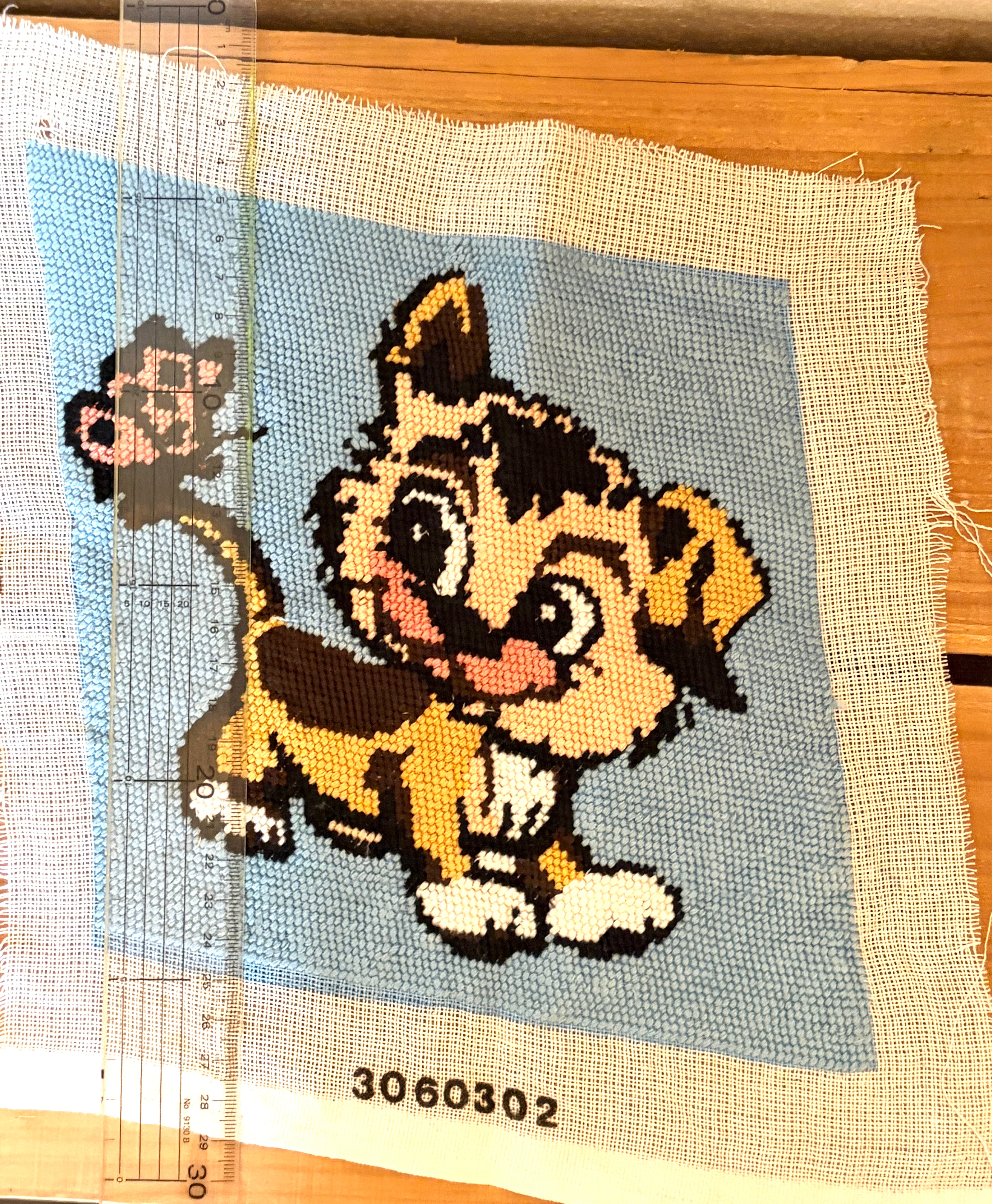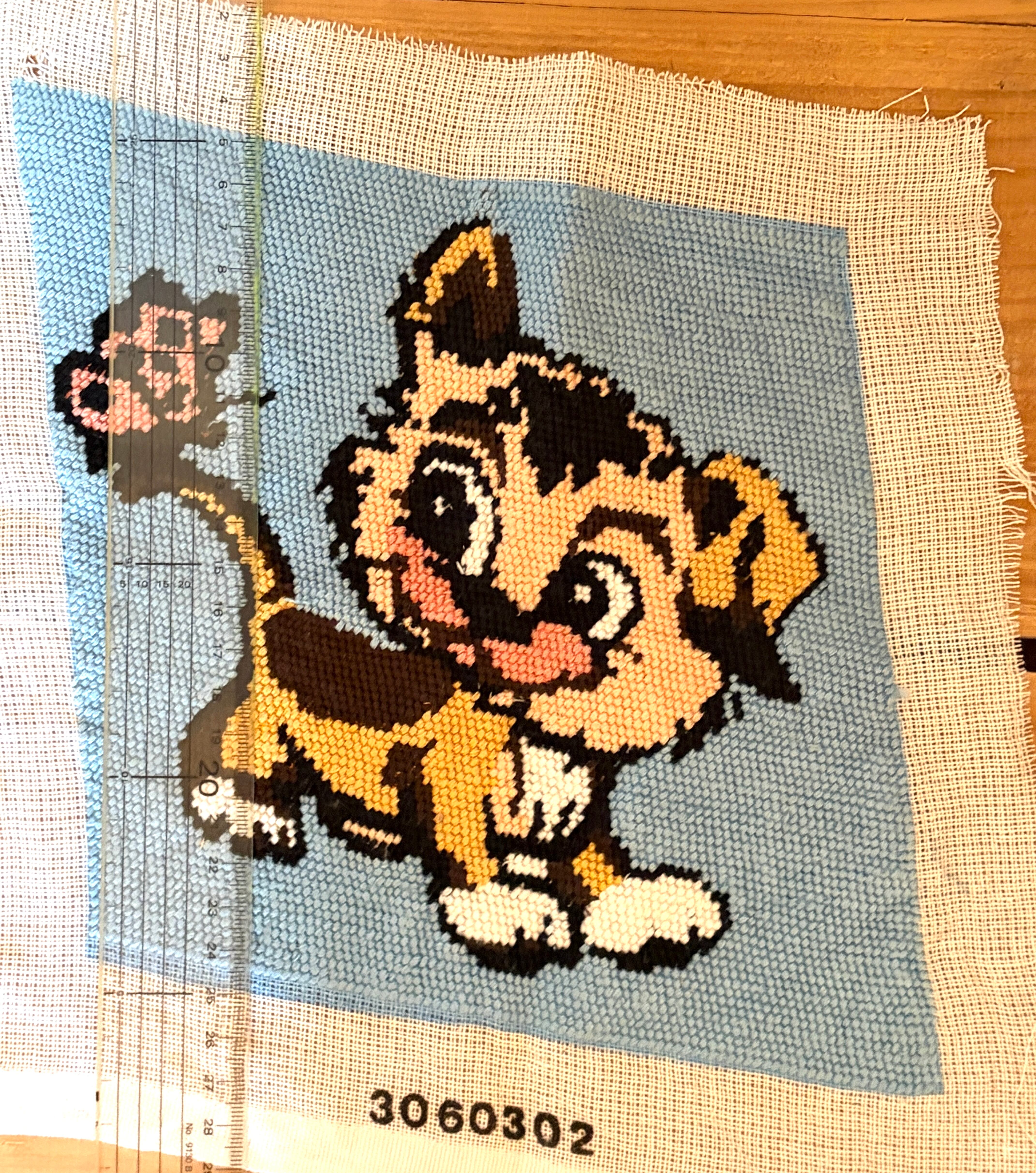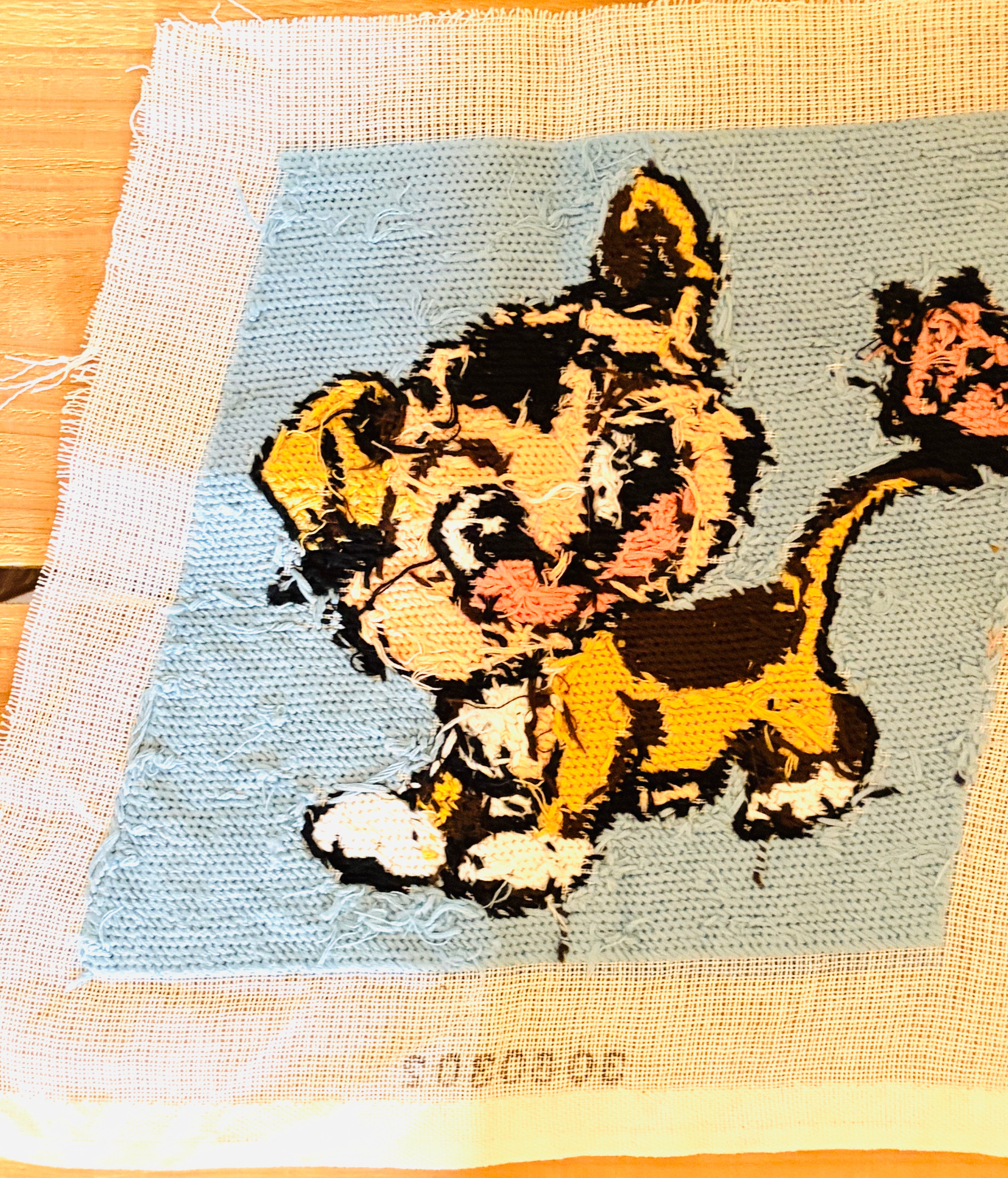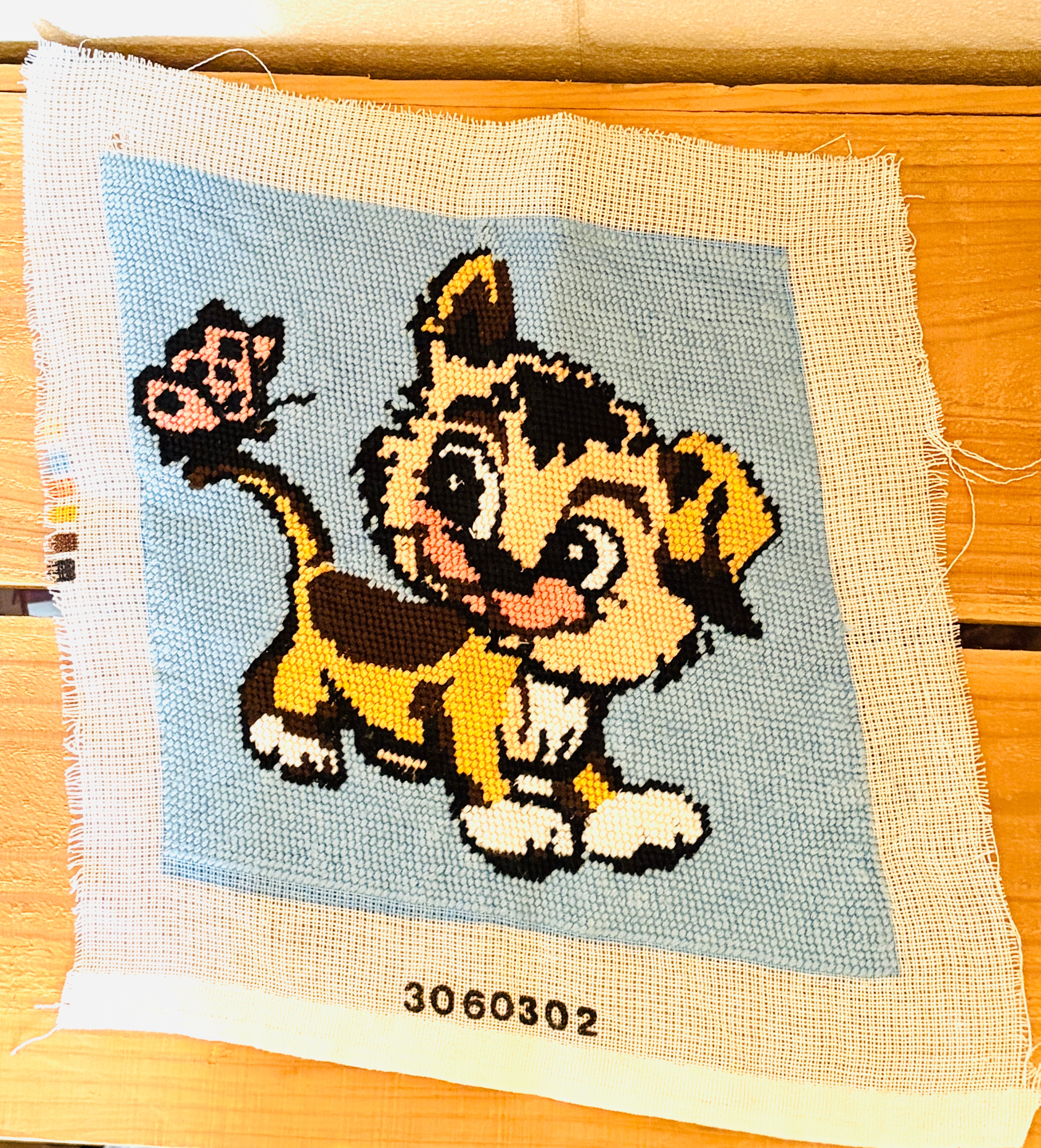 蝶々とトラ柄の猫さんのニードルポイント【ハンドメイドのヴィンテージアイテム】