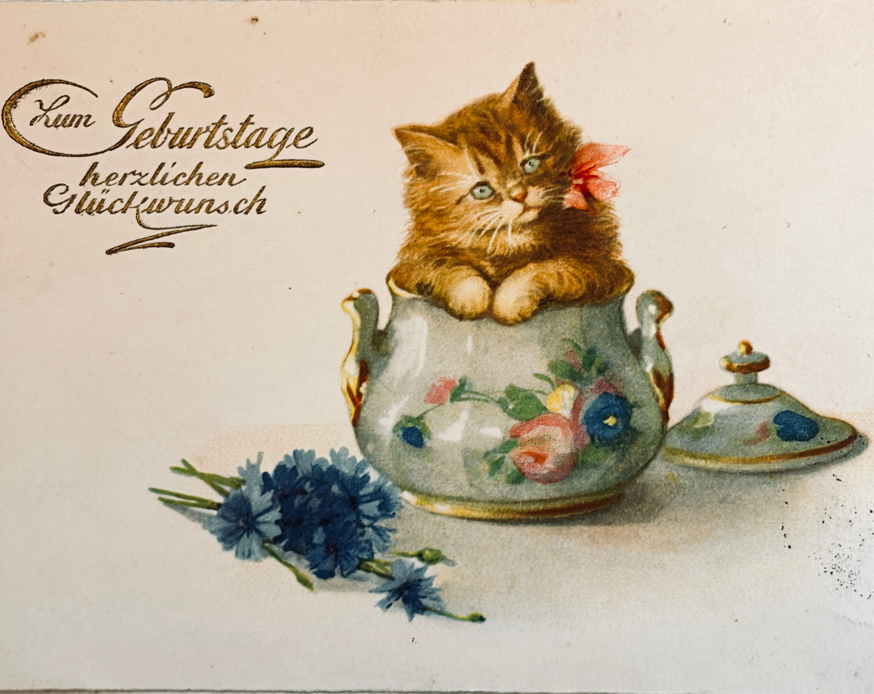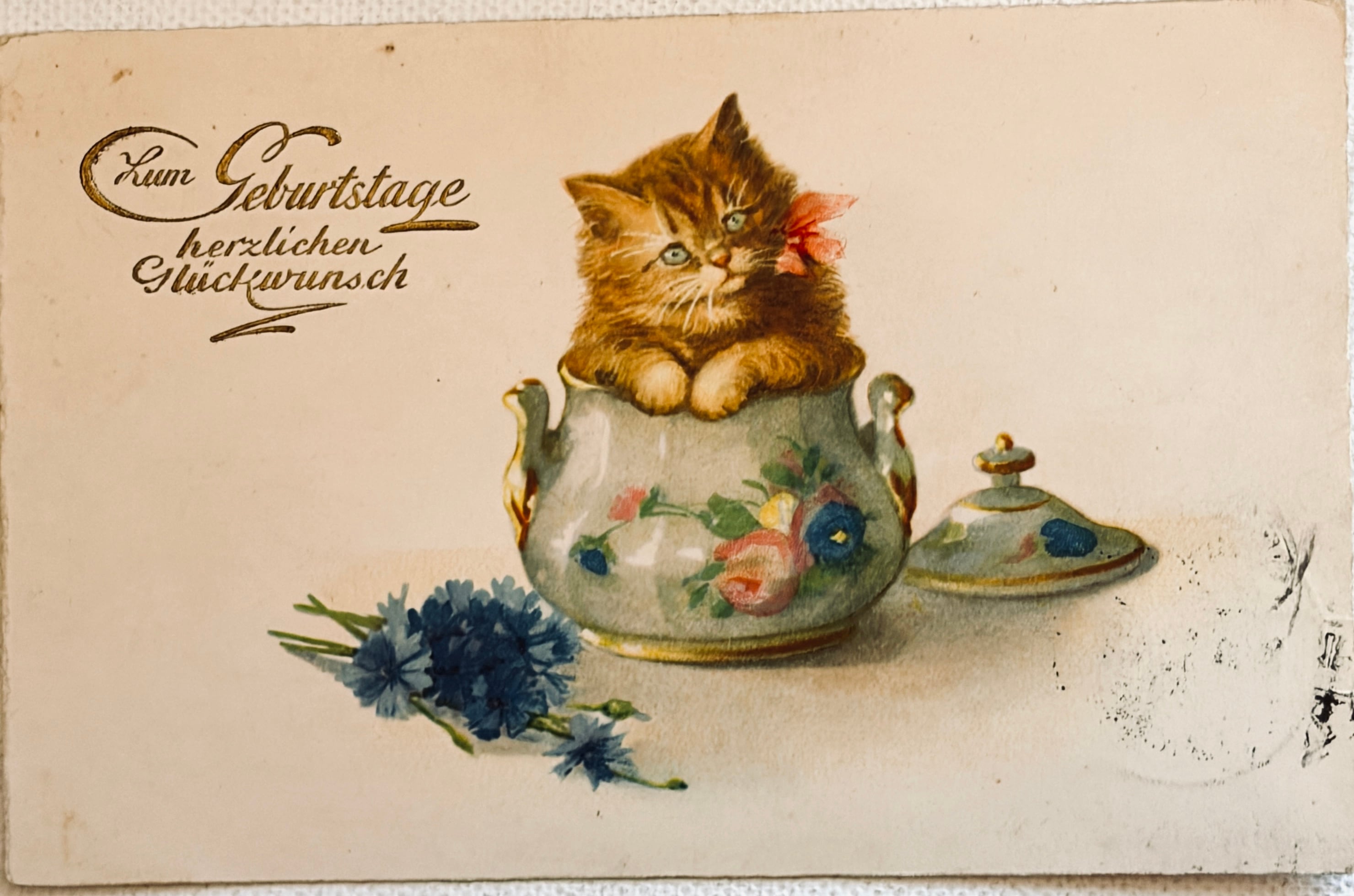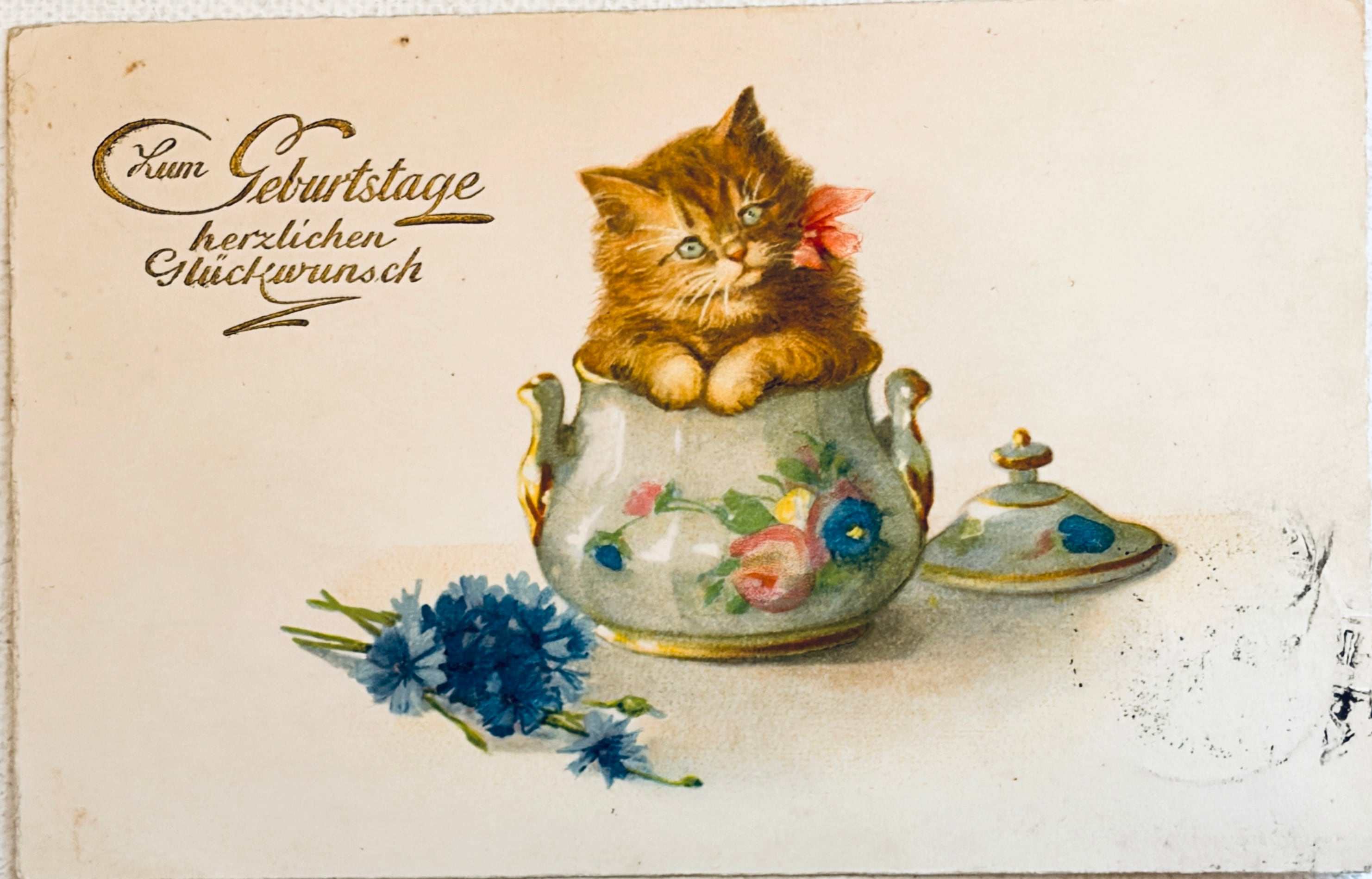 可愛いシュガーポットに入った猫さんのポストカード【ドイツ1932年消印】