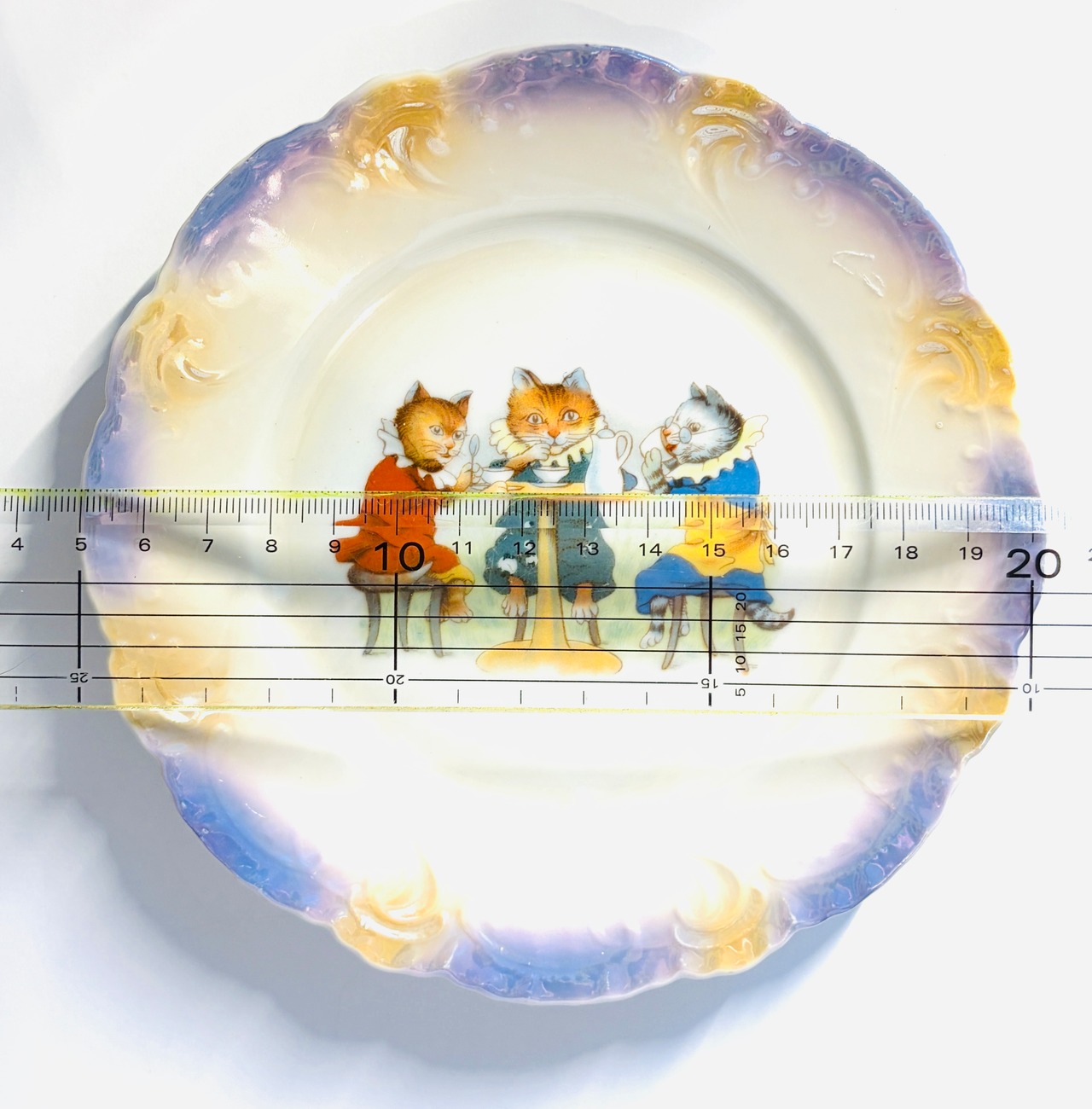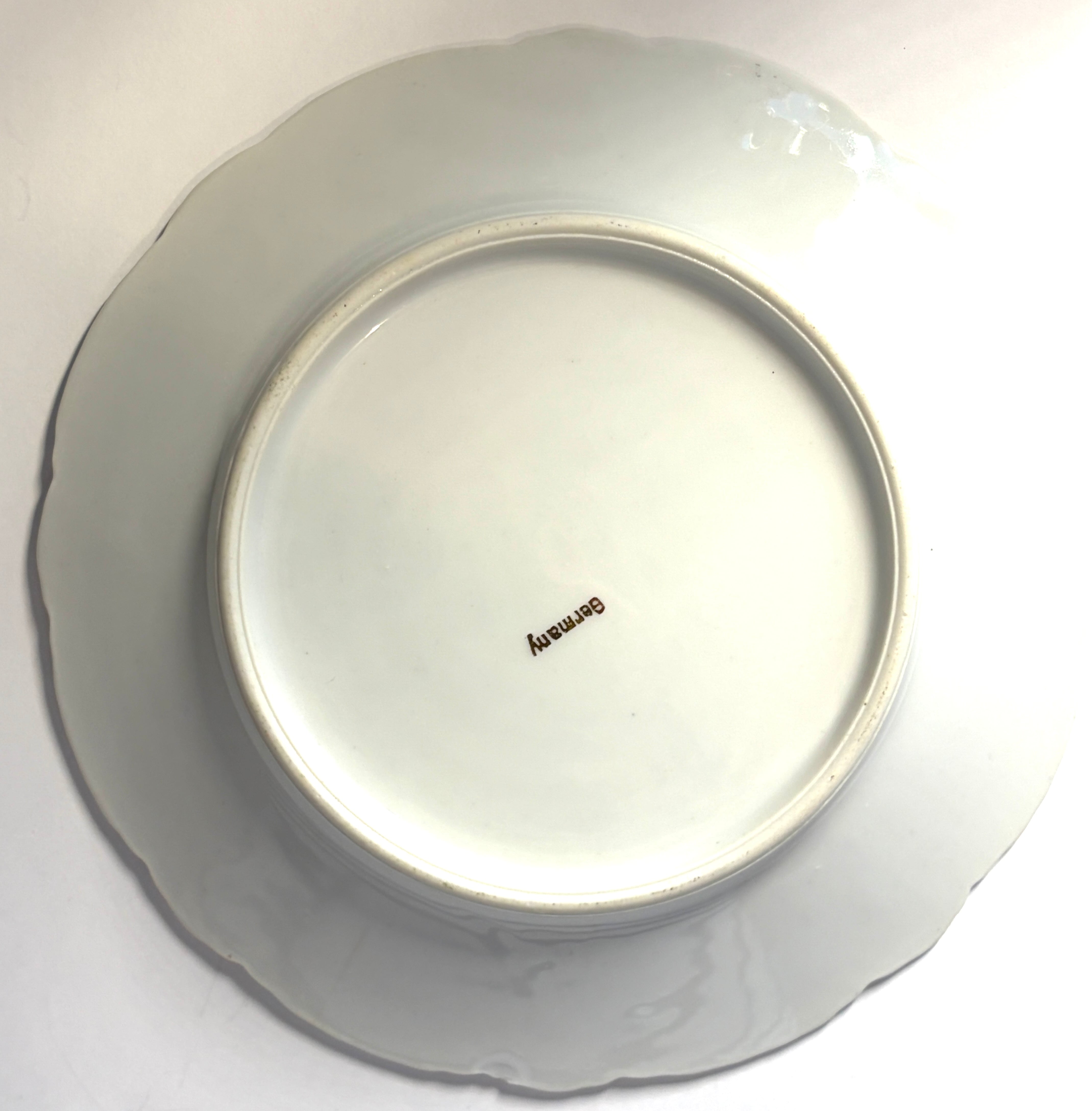 プレートの縁が真珠のように虹色に輝いている場合、「ラスター彩」という金属被膜を焼き付ける技法が使われています。これによって、アンティーク特有の柔らかな光沢が生まれます。