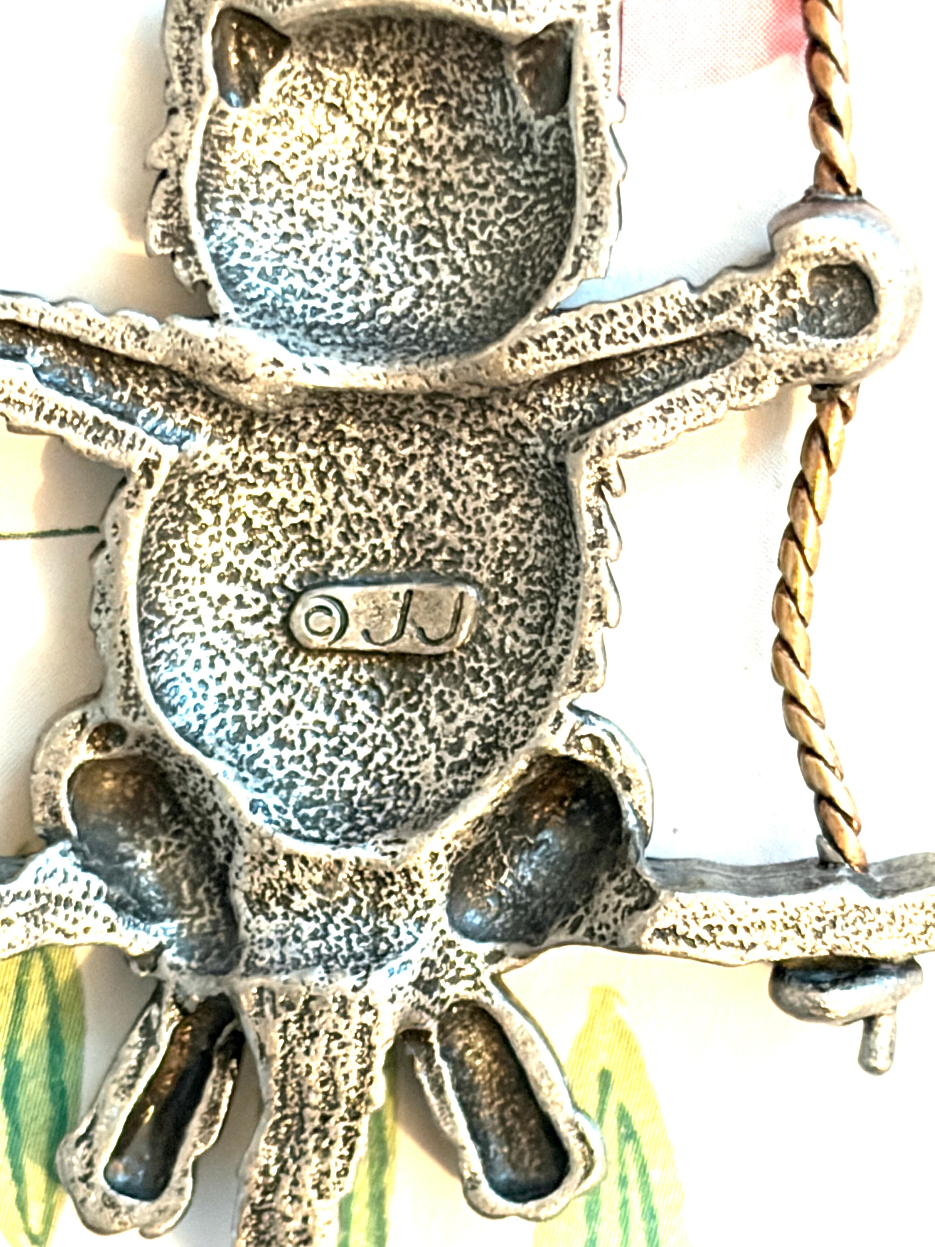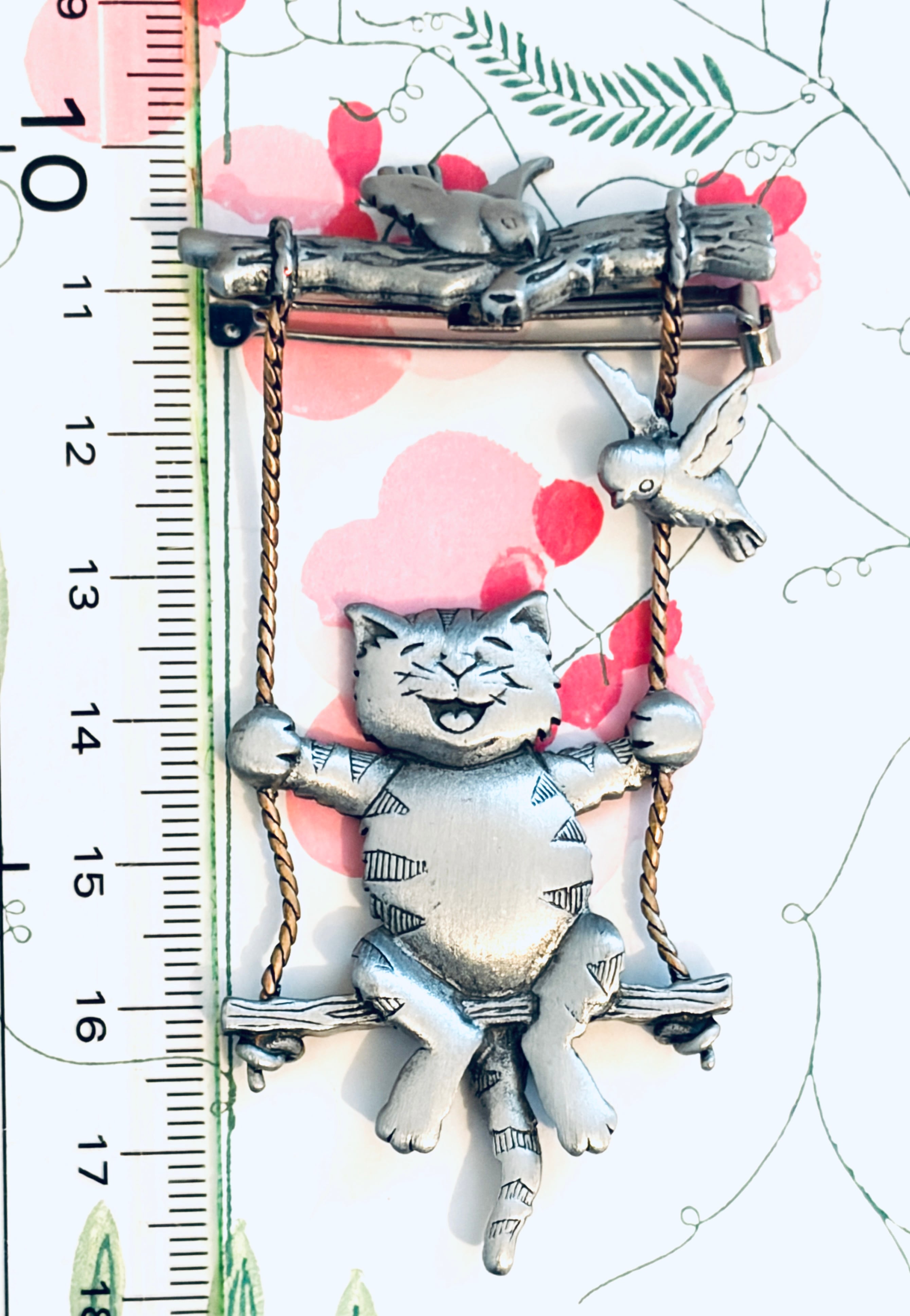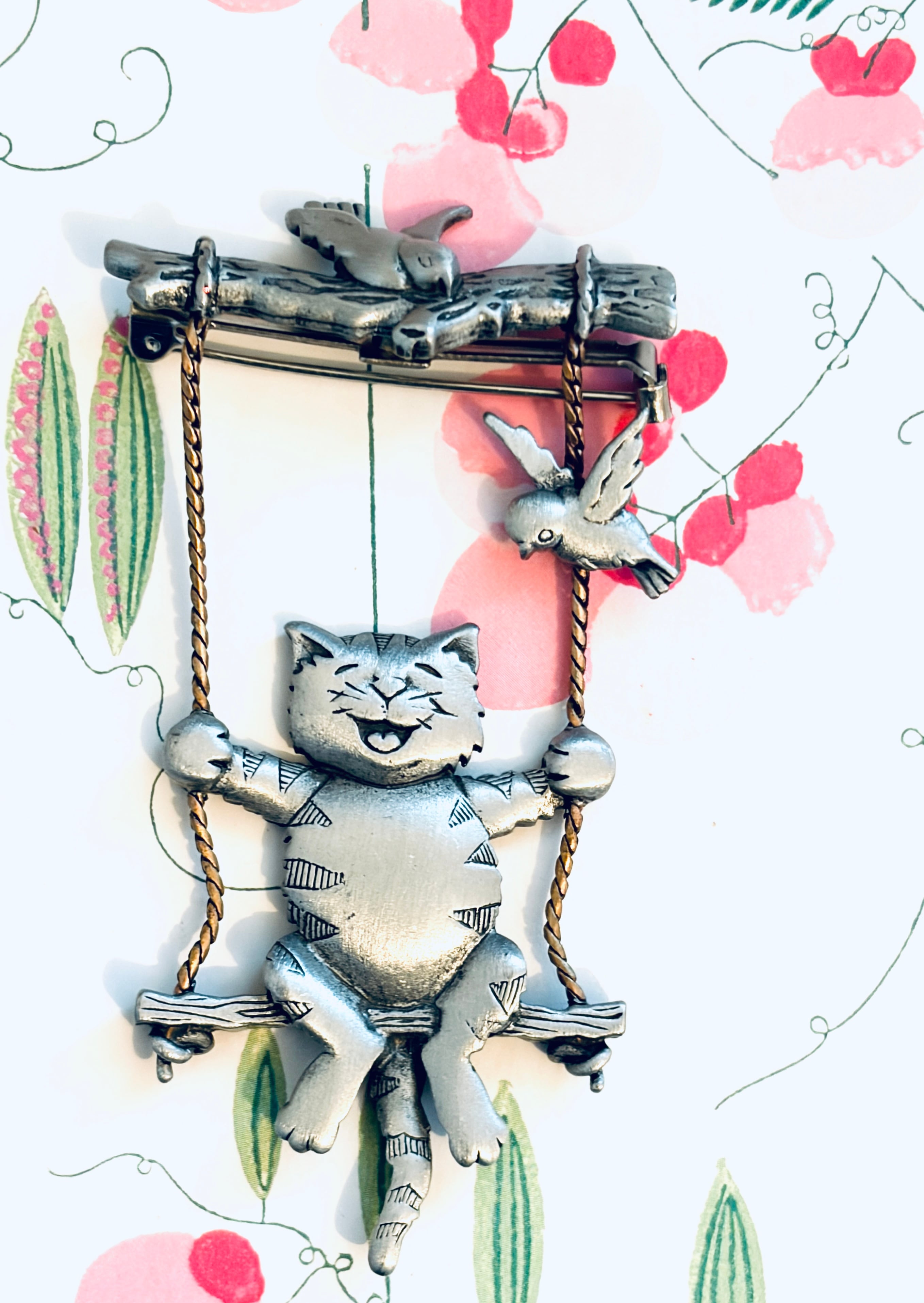 【再入荷】ニコニコ顔の猫さんがブランコに乗ったブローチ【アメリカ J J社】